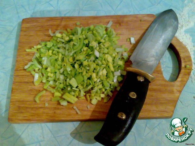 Лук порей также порубить на мелкие кусочки, обжарить в сливочном масле 1-2 минуты.