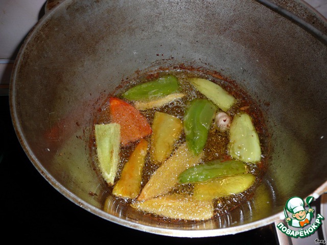 И тут самое интересное: разрезаем перцы и в масло.... бланшируем 1 мин.