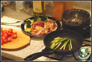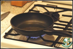 • = Прокаливаем на сковородке оливковое масло. Весь процесс приготовления должен проходить непрерывно, на достаточно интенсивном огне - на хорошо раскалённой сковородке.