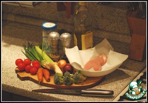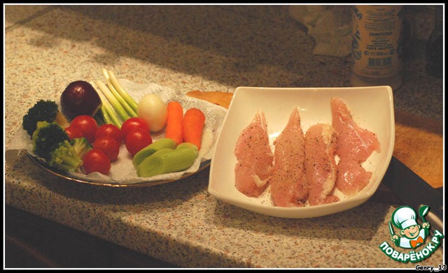 = Филе грудки курицы хорошо промываем холодной водой и сушим бумажным полотенцем. Овощи чистим, моем и сушим.