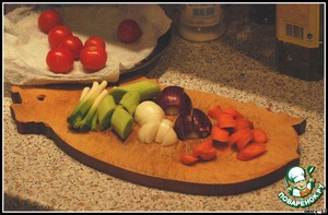 • = Нарезаем морковь – под углом на небольшие кусочки. Каждую половинку луковицы репчатого лука разрезаем вдоль на 4 части.