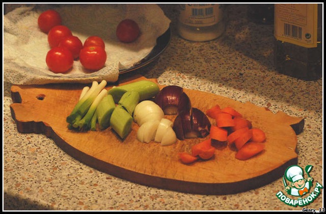 = Нарезаем морковь – под углом на небольшие кусочки. Каждую половинку луковицы репчатого лука разрезаем вдоль на 4 части.
