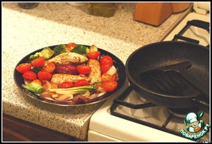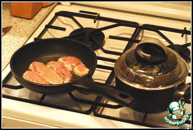 • = Кусочки грудки быстро обжариваем с двух сторон на раскалённой сковородке (всего 5-6 мин.).