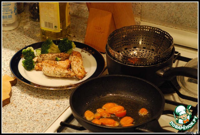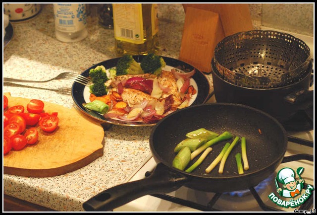 • = Выкладываем со сковородки в тарелку кусочки грудки и «Брокколи» из пароварки и прямо в тарелке солим по вкусу.