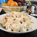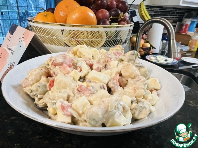 Гребешки разбираем на волокна. Выкладываем все в чашку, добавляем майонез и хорошенько перемешиваем.
