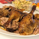 Готовую утку разделать на порционные куски, а на гарнир – запеченная начинка. Это вкусно!