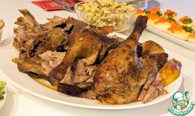 Запечь, в предварительно разогретой духовке, при температуре 180 градусов до готовности, периодически поливая образующимся соком.