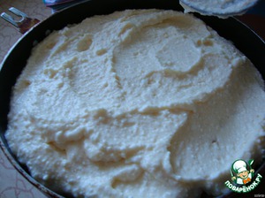 Взять форму, диаметр советую побольше (хотя бы 26 см) и, как выяснилось, лучше разъемную, смазать хорошенько маслом и вылить в нее жидкую половину теста.