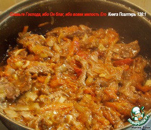 Когда немножко потушится добавляем болгарский перчик, тыкву. Солим перчим. Минут через 10 добавляем томатный соус, солим перчим и еще тушим на медленном огне минут 10.