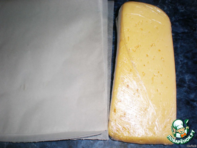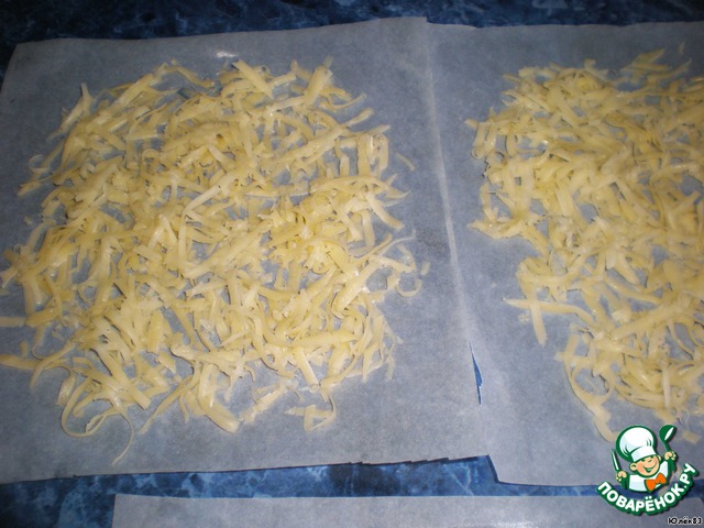 Нарезать бумагу на квадраты и смазать растительным маслом. Сыр натереть на терке длинненькими тонкими полосочками.