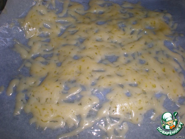 Положить бумагу на противень и отправить в разогретую до 200с духовку на 1 минуту, чтобы сыр расплавился, но не растекся.