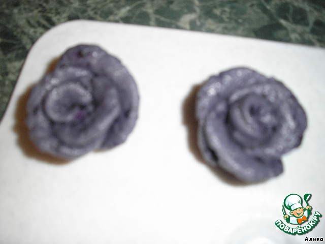 Аккуратно выкладываем наши розочки на противень. Чтобы дно бутончика получилось устойчивое, держа за бутончик, приминаем к противню.