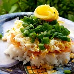 Яйцо, натертое на терке, мелко порезанный лук и зелень.
