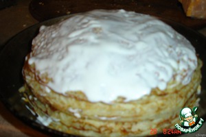 Верхний блин смазываем сметаной и в духовку на 20 мин.