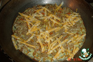 А сейчас собираем наш пирожок: кладем блинчик - на него ложку с горкой начинки, распределили по всему блинчику, посыпаем сыром