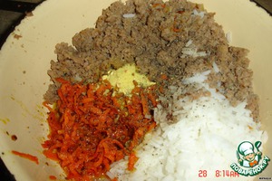 Смешиваем перемолотый фарш, рис, обжаренную морковь, яйца, соль, перец и 50 мл горячей воды. -