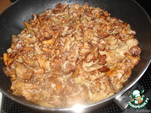 Разогреваем жир, и на горячую сковородку кладём наше "лукошко", ой, нет, не корзинку, а грибы! Жарим, пока жидкость не упарится…