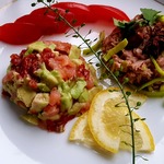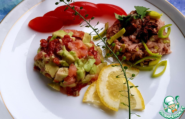 в лосось добавляем мелко нарезанные авокадо и вяленые помидоры, заправляем соком лимона и оливковым маслом, солим и перчим.