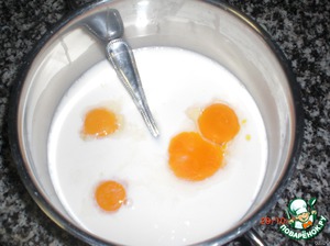 Готовим первый слой: смешиваем сгущёнку, желтки и молоко (не взбиваем).