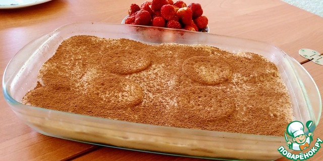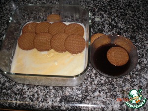 сверху кладём второй слой-печенье, замоченное в кофе, по рецепту нужно печенье "Мария"-это сладкое рассыпчатое галетное печенье, но можно заменить другим, главное, чтобы хорошо впитывало кофе.