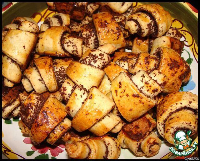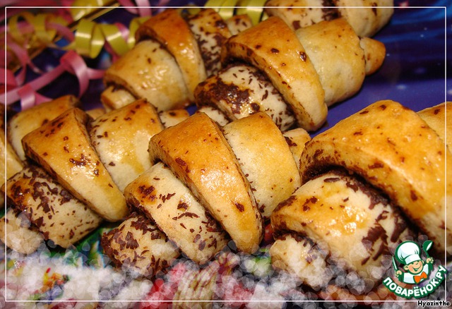 На удивление, шоколад не потек и не подгорел. Вот такие румяные и плотненькие рожки получаются. |