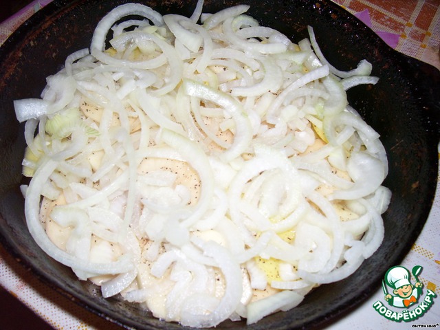 Лук нарезать полукольцами. Выложить поверх картофеля.
