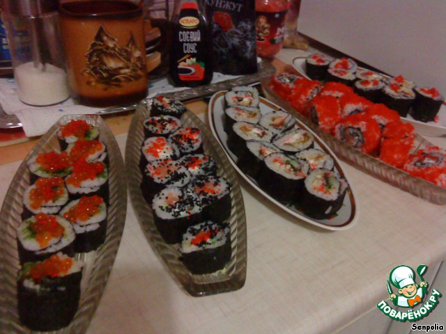 Правда заправку риса делал по другому рецепту,не нашёл рисового уксуса и сделал с яблочным:4 ст ложки уксуса, 2 ст.ложки сахара,1 ч.ложку соли.Все смешал,30 секунд подогрел в микроволновке ,размешал до полного растворенияи получил заправку.Все получилось бесподобно.Спасибо автору и советам в комментариях.