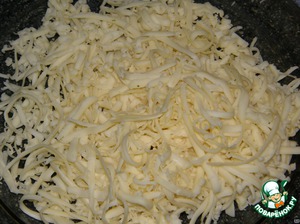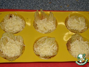 В полученные цветочки из чипсов кладём натёртый сыр, слегка утрамбовывая, но не перестарайтесь, чипсы имеют свойство ломаться. Форму с будущими тарталетками ставим в горячую духовку буквально на 5 мин.