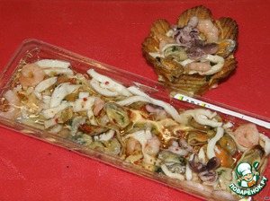 Следом на рукколу выкладываем морепродукты (советую заранее их достать из маринада, хотя бы просто на сухую тарелку, будет меньше жидкости).