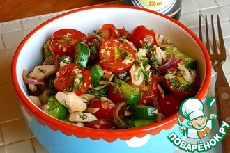 На днях я пролистала свои старые кулинарные записи и наткнулась на этот салат, который часто раньше готовила, а потом он был незаслуженно забыт мной... Салат из серии "на каждый день", готовится очень быстро, а продукты имеются в каждом "уважающем себя" холодильнике )))