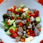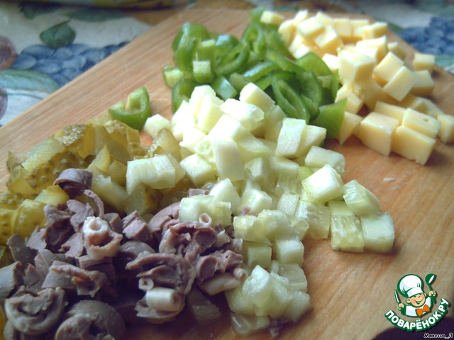 Нарезаем кубиками сердце, сыр, свежий и маринованный огурцы, а перец нарезаем крупнее, полосочками!