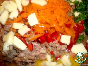 К фаршу добавить натертую на крупной терке морковь, мелконарезанную петрушку, яйца, сыр сулугуни, нарезанный кубиками.