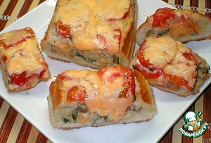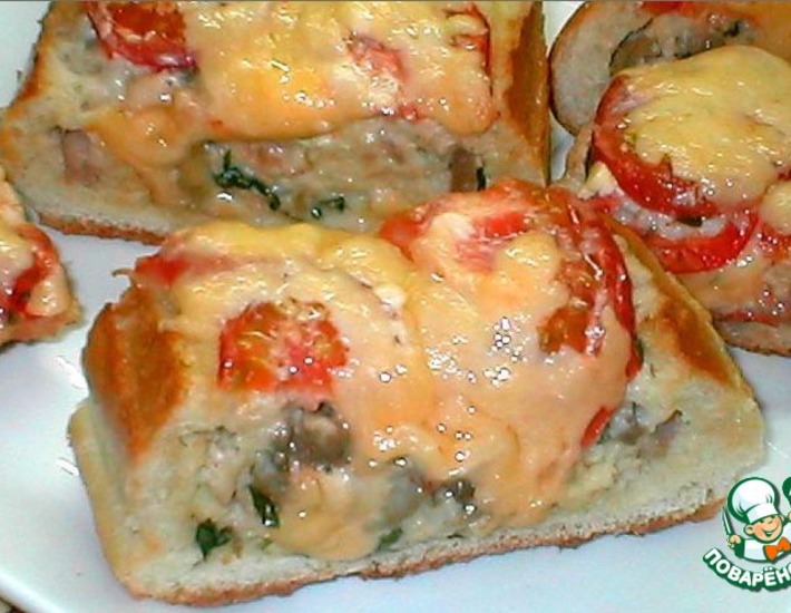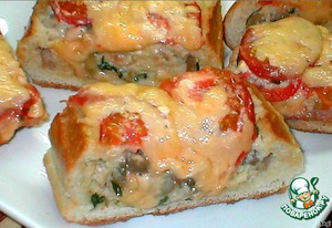 Заполняем смесью батон, сверху выкладываем кружки помидоров (по желанию), слегка смазываем майонезом. -