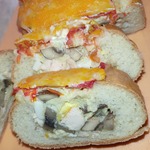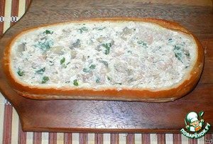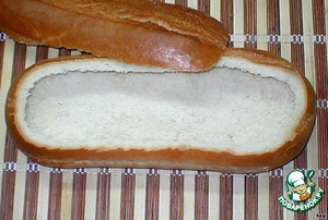 Берем батон белого хлеба, срезаем верхнюю корку, вынимаем мякиш, оставив только 1-1,5 см у корки.