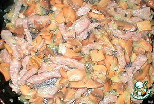 На сковороде обжариваем куриное филе, бекон, по желанию - мелко нарезанную луковицу, грибы (ваши любимые). -