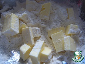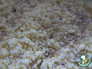 В муку добавим 1/2 ч.л. семян кунжута, соль, порезанное на кубики или натёртое на тёрке сливочное масло.