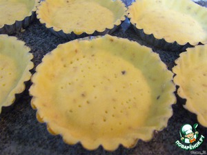 Тесто раскатаем, выложим в формочки-тарталетки. Дно проколем вилкой.