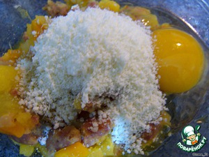 Добавим яйца, тёртый сыр Пармезан. Хорошо размешаем. -