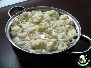 Цветную капусту разобрать на кочешки и замочить в растворе уксуса на 15-20 минут (1 столовая ложка уксуса на 1 л воды).