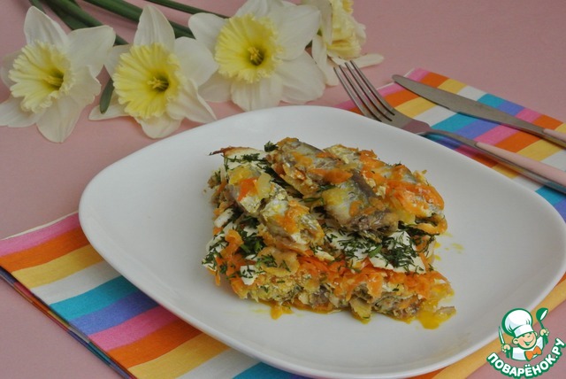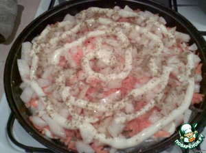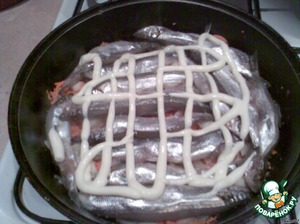 Дальше снова лук и морковь, сверху рыба, каждый слой сбрызгиваем растительным маслом. Последним должен быть слой овощей, смазанных майонезом.