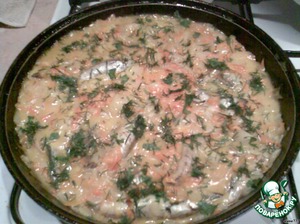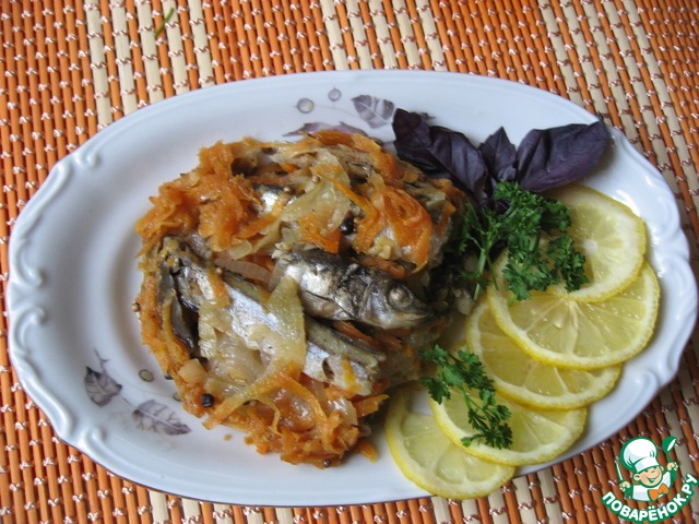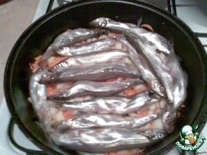 Вымытую мойву уложить сверху на морковку и лук, посолить, поперчить.