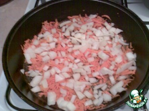 Морковь натереть на крупной тёрке, лук порезать. На сковороду влить немного масла и насыпать слой овощей.