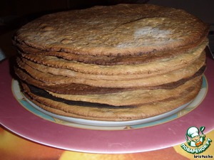 Пергамент на противень - и в духовку при 200 гр. Пока печётся первый, на втором листе катаю следующий корж. Пекутся коржи быстро, ок. 4 минут. Надо следить, чтобы не сгорели. Как только корж стал красивого оранжевого цвета – готов. Коржи охлаждаем на решетке. Друг на друга горячими не складываем, только когда остынут.
