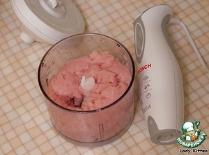 Куриное филе измельчить в блендере (или пропустить через мясорубку). Т. к. у меня нет мясорубки, я пользовалась блендером *PARDON*.