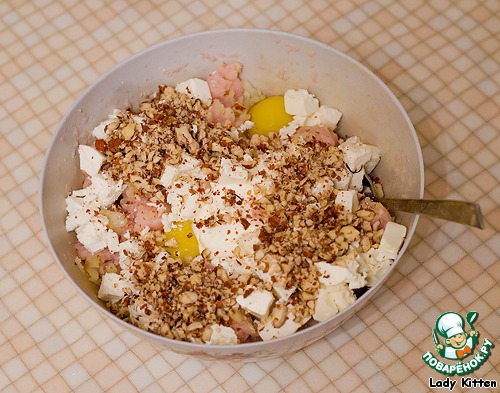 В миске смешать куриное филе, обжаренные лук и чеснок, картофель, сметану, яйца, раскрошенный сыр и крупно порубленные орехи. Посолить, поперчить, добавить тмин и мяту.