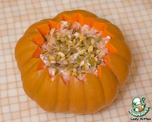 Заполнить тыкву фаршем. Сверху посыпать тыквенными семечками и сбрызнуть оливковым маслом.