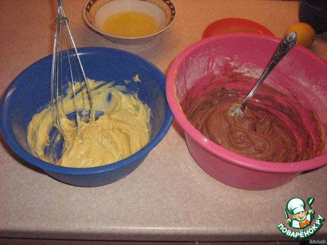 Поделить смесь пополам и добавить какао в половину теста. Добавить в другую половину тертую лимонную цедру.