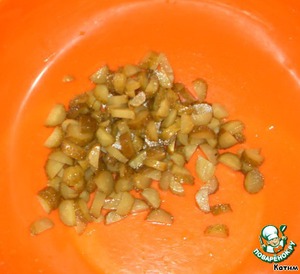 Маринованные огурчики режем кубиками. У меня были совсем маленькие, и я порезала полукольцами.