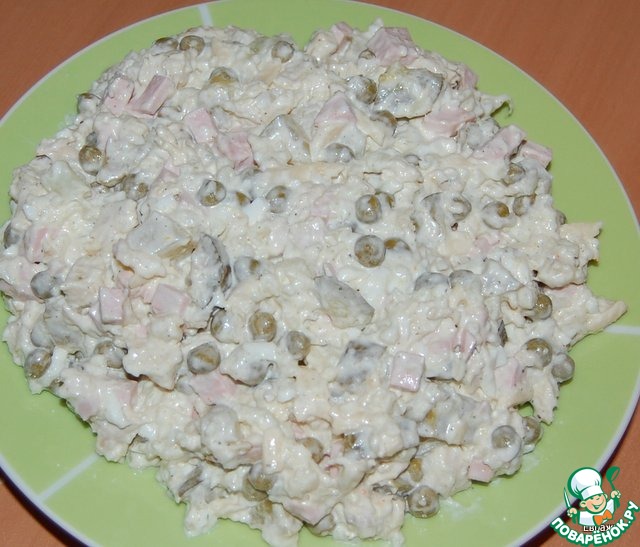 Перемешиваем, солим по вкусу, заправляем майонезом, смешанным с 2 столовыми ложками маринада от огурчиков.