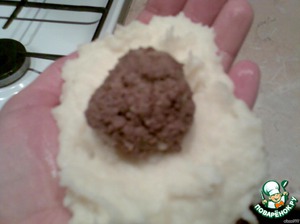 Теперь лепим шанежки мокрыми руками: на одну ладонь кладем картофельное тесто, сверху шарик из ливера. Формируем булочки-шанежки.